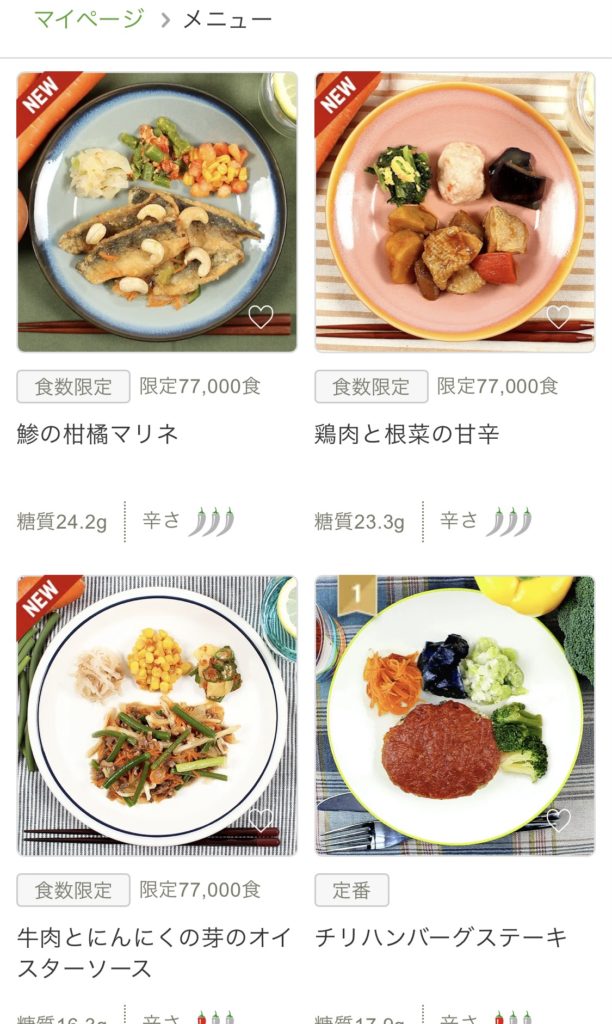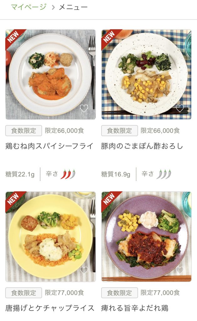 60種類以上のメニューから、自由に選べます。新メニューも毎週追加されるので、長く継続していても、飽きる事がありません。食材フィルタ、辛い物など細かいところまで配慮があります。