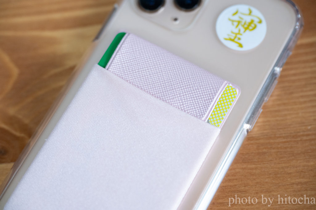 裏側の両面テープで、スマホやケースの裏に貼り付けるカードポケット。